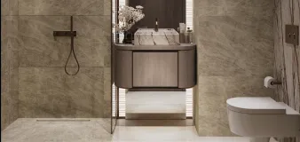 Contemporary bathrooms fitted with Jaguar-branded sanitary ware, vanities, and integrated lighting. Finished with elegant wall finishes and modern fittings for a clean, refined look.